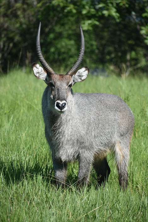Su alimentación es basada en variedad de herbáceas (pastos cercanos a fuentes de agua). Presentan cuerpo y cuello alargados pero patas cortas. Su pelo es áspero y largo, formando pequeñas melenas en el cuello. Presentan coloraciones grisáceas y/o marrón, la parte inferior de las patas es negra y presentan un anillo blanco en la parte posterior de sus cuartos traseros. Solo los machos presentan un par de cuernos pesados y muy anillados, que llegan a medir cerca del metro de longitud. La longitud corporal varía de 1.8 a 2 m y el peso de 374 a 462 Lb
